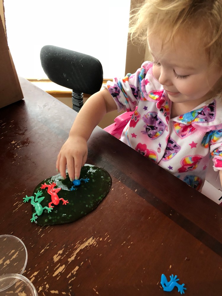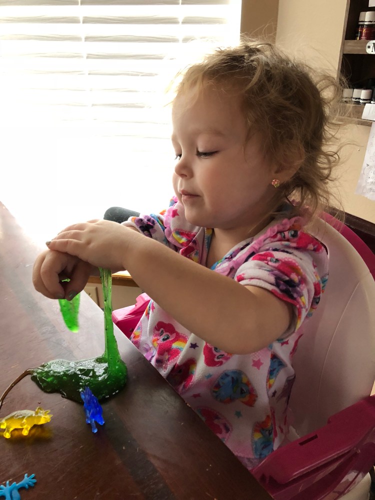 Not only have Matthew and Grace played with it for almost an hour at a time with no fighting or pestering (who knew a nine year old and two year old could pester each other so much?!) but Grant also loves it. Grace is constantly asking to play with slime. She’s played with the frogs in it, she’s played with her dinosaurs in it. She’s played with her little Hatchimal surprise toys in it. She loves slime!! And when she plays with it, it’s usually for 30-45 min at a time which allows me time to do anything I chose to do…which is usually feeding Grant or sitting with him while he watches his ipad 🙂