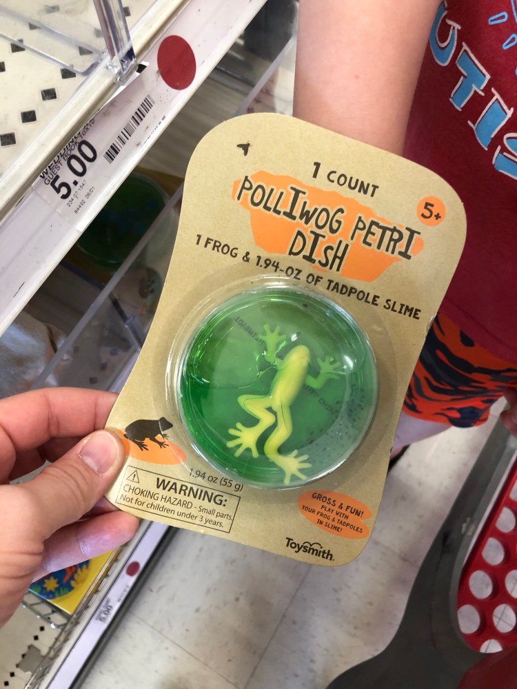 Just recently on a trip to Target Matthew found some slime in a plastic petrie dish with a frog in it. Of course it was in the Dollar Spot for only $1 so we had to get three…one for each of them. That was the best $3 I have spent in a long time.